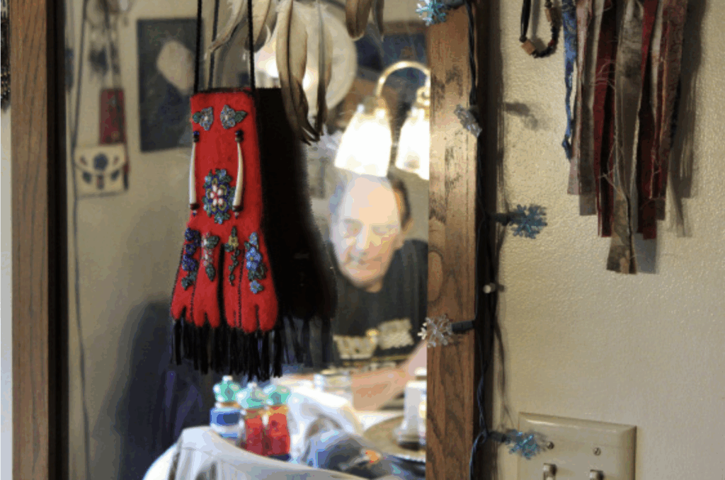 “My auntie MaryAnn has been advocating for decades for our tribe’s fishing and subsistence rights. In her work, she has met many other Indigenous leaders and advocates and has been given gifts like this bag in honor of her work and friendship. In the background, my uncle Bill.”