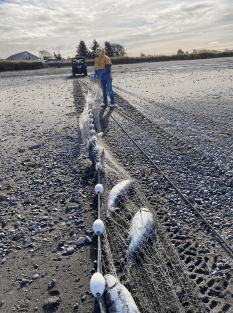 “My cousin Julianne pulls out the gill net with some fresh salmon that will be brought back to the Tribal fishery to be cleaned.