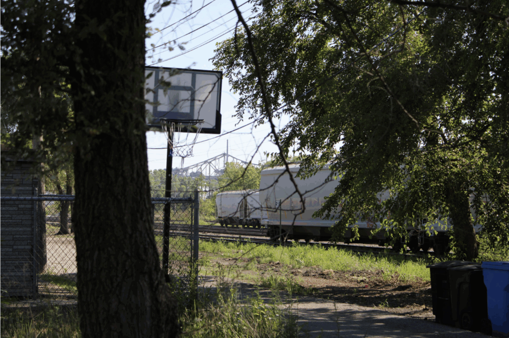 First, the story of how industrial pollution impacts her and the people of her community. One photo depicts a basketball court covered with weeds and located right next to a train track.